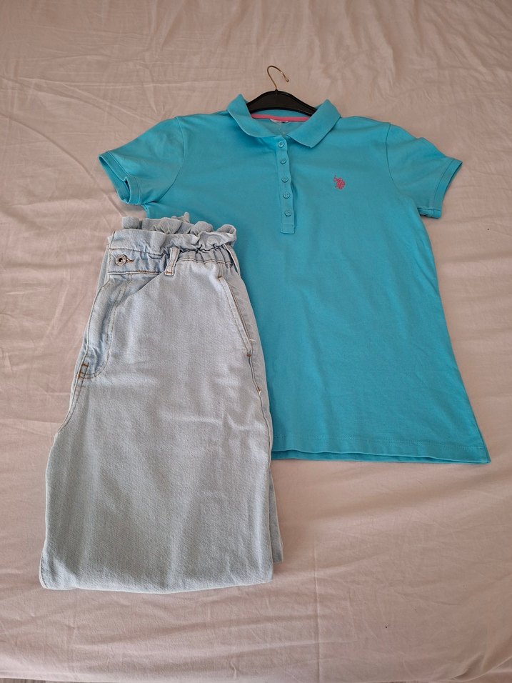 pantolon 1 kere giyildi yepyeni. rahat kesim, kısa kollu ve yakalı polo tişört. Pastel mavi renkte, sokak modasına uygun şık bir parça.