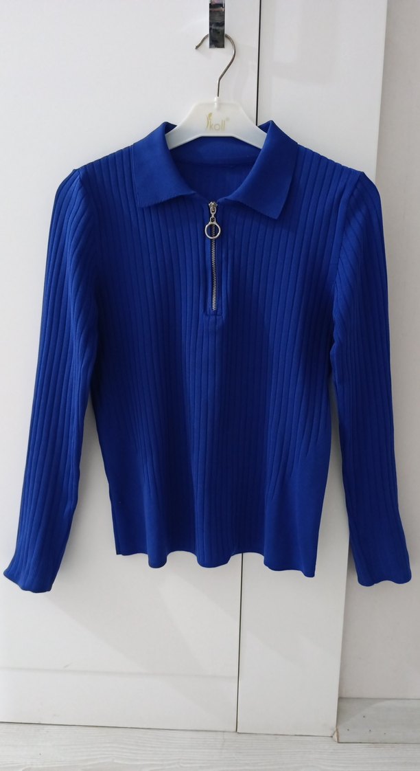 Mavi renkli, polo yakalı ve uzun kollu, önü fermuarlı, kısa kesim kadın triko kazak. Sokak stiline uygun, trend ve rahat bir model.