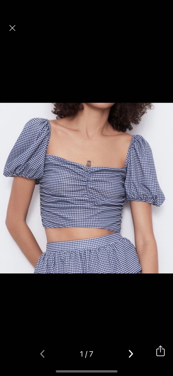 Pamuklu, mavi pötikareli, kısa kollu ve kısa boylu, tekne yaka, pileli tasarıma sahip, vücuda oturan kadın bluzu. Zara marka yeni sorunsuz s beden iki kere giyildi
