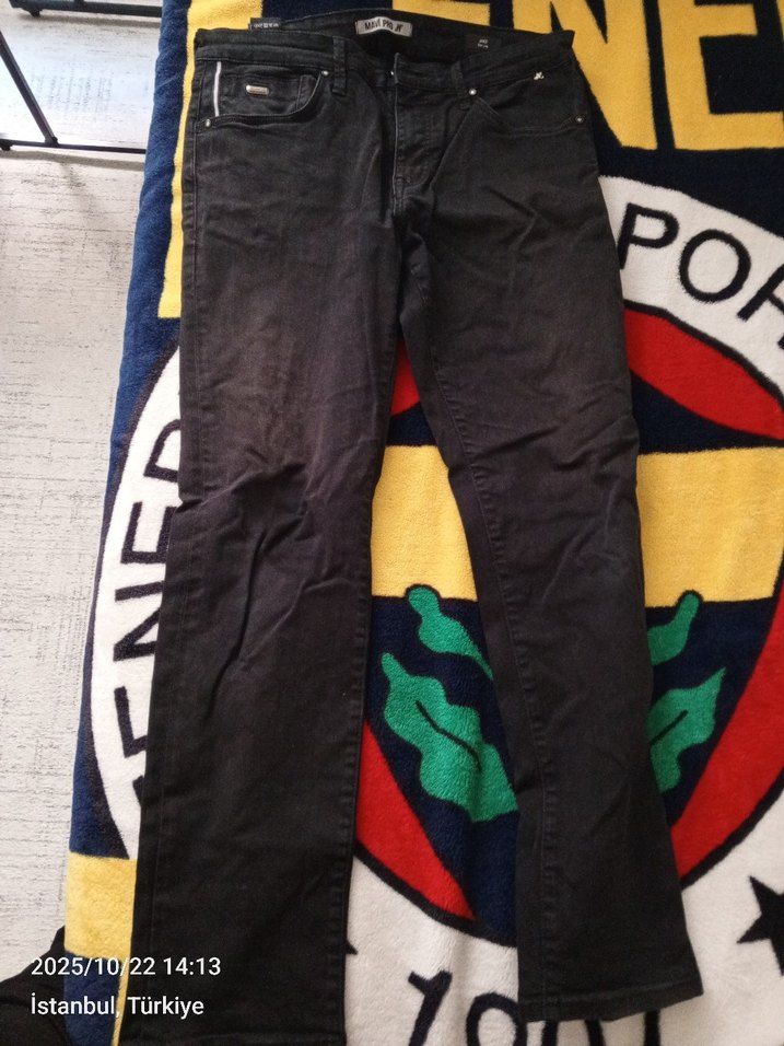 rengi hafif solmuş Kullanılmış Siyah, salaş kesim, normal boyda erkek kot pantolon. Sentetik kumaştan üretilmiş, kemerli ve desensiz tasarıma sahip, günlük kullanıma uygun.
