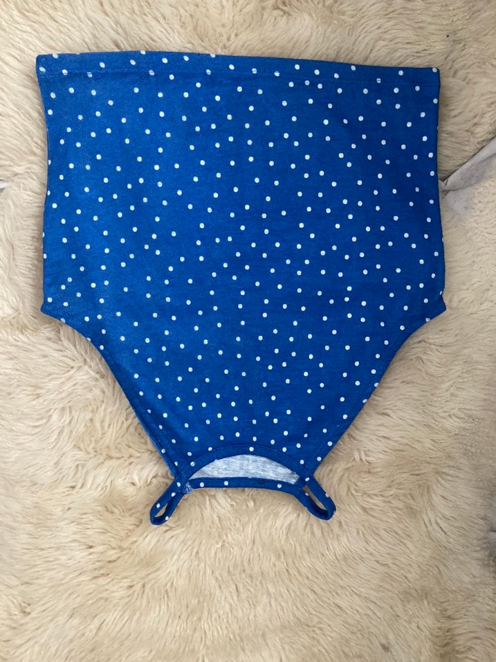Mavi, parlak yüzeyli ve beyaz puantiyeli bebek slingidir. Rahat taşıma için tasarlanmıştır.