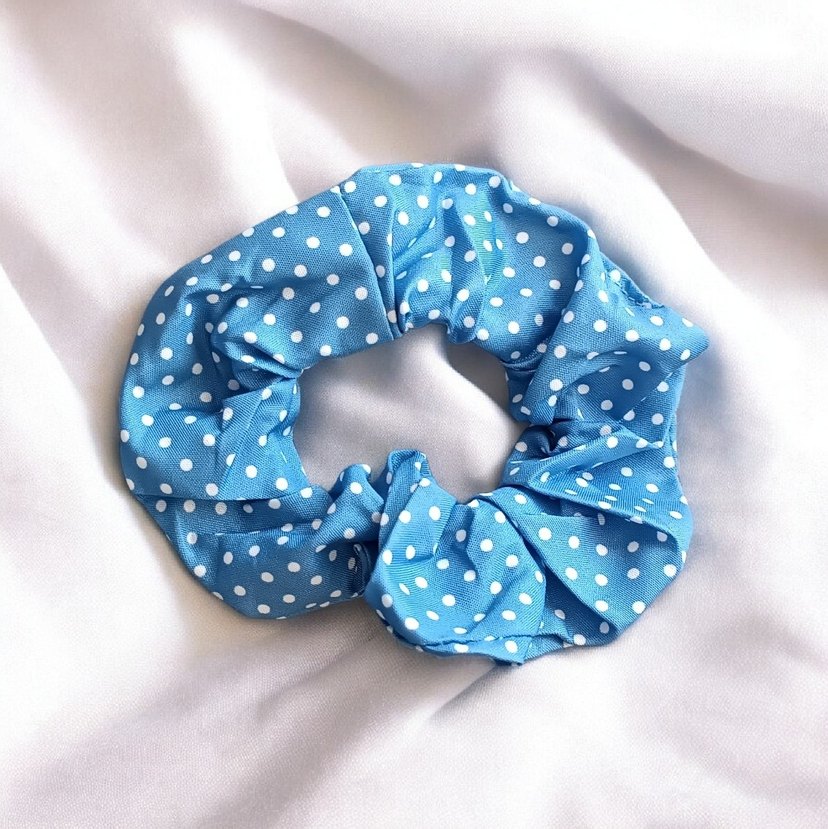 Mavi zemin üzerine beyaz puantiyeli, yumuşak sentetik kumaştan yapılmış lastikli toka. Renkli vintage bohem stiline uygundur.