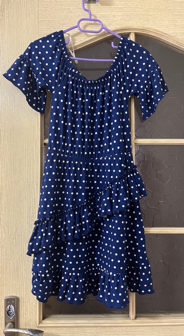 Mavi puantiyeli, kısa kollu, askısız yakalı, bol kesim midi elbise. Sentetik kumaştan, parlak desenli ve volan detaylı bohem tarzda günlük kullanıma uygun.yurtdışı ürünü 10 yaş