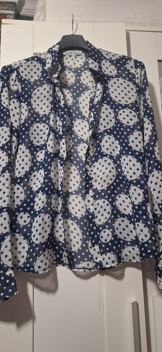 Mavi puantiyeli, bohem tarzda, yakalı ve düğmeli uzun kollu gömlek. Rahat kesim ve midi boyda, günlük kullanıma uygundur. Şifon bir üründür.