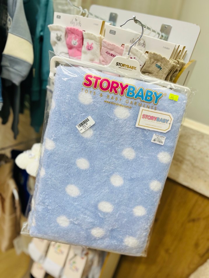 STORYBABY markalı, beyaz puantiyeli mavi çocuk battaniyesi. Yumuşak ve sıcak dokusu ile çocuklar için uygundur.