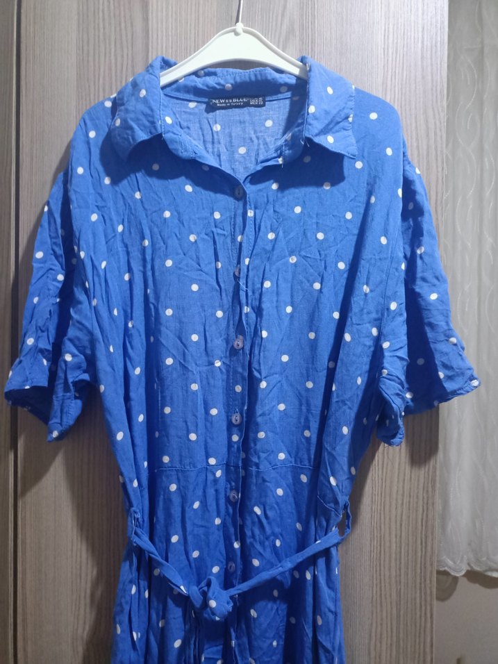 Mavi renk, puantiyeli, düğmeli, kısa kollu, yakalı, bol kesim elbise. Rahattır belindeki kuşak sayesinde ayarlanabilir dize kadar düğmesi vardır. Ürünlerimde pazarlık payı vardır