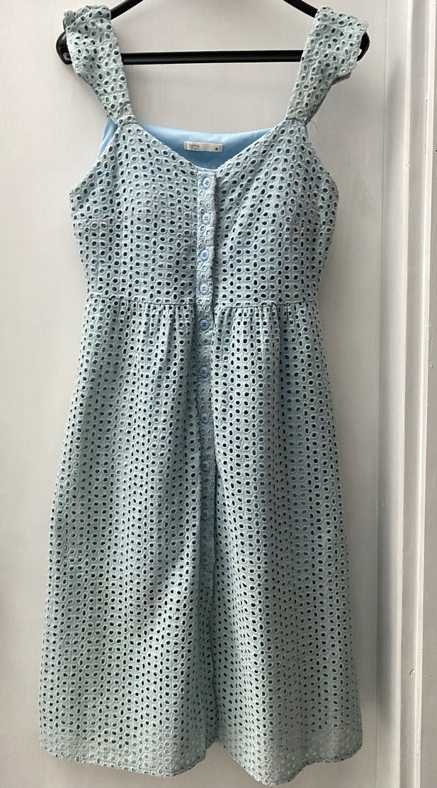 Düğmeli, V yakalı, kolsuz ve bele oturan mavi puantiyeli midi elbise. Vintage bohem tarzıyla dikkat çeker.