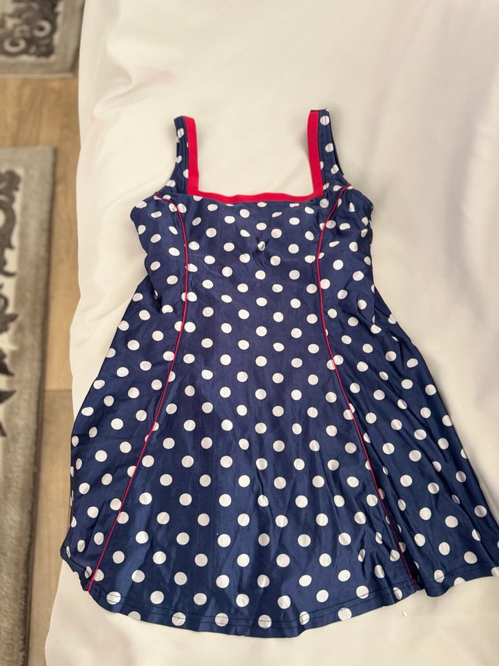 Mavi puantiyeli, düğmeli, midi uzunlukta, vintage tarzda, kolsuz mayo. Plaj için uygun renkli tasarım. ️