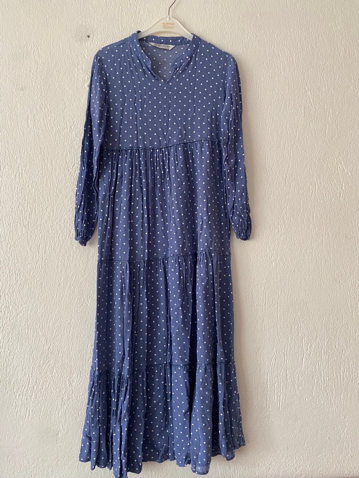 Mavi puantiyeli uzun elbise, pamuklu kumaştan, uzun kollu ve V yakalıdır.