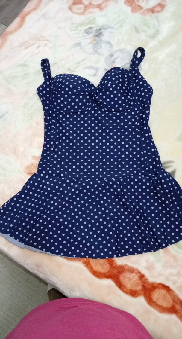 Mavi zemin üzerine beyaz puantiyelerle tasarlanmış, fırfırlı mini etekli, kolsuz ve vücuda oturan mayo. Cesur, Paris sokak modası tarzında, günlük kullanım için uygundur.