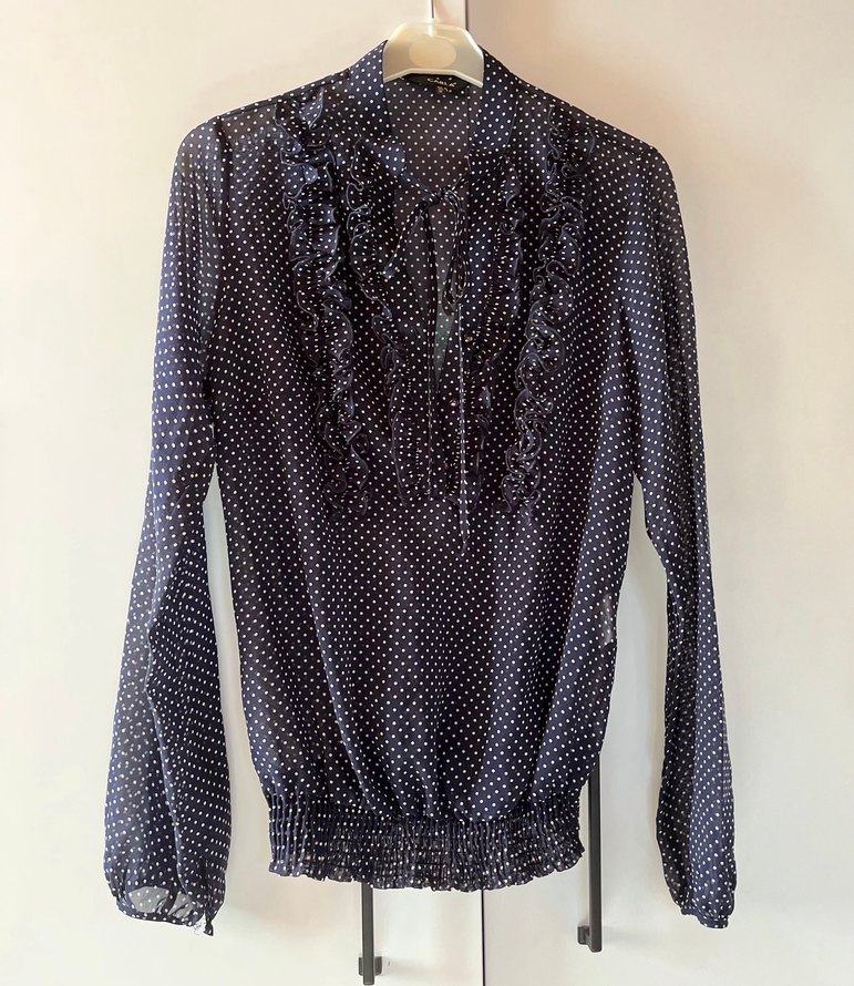 Uzun kollu, V yakalı ve ön kısmında fırfır detaylı koyu mavi kadın bluzu. Puantiyeli desenli, midi boy ve bol kesimdir, ofis kullanımı için uygundur. ✨ Transparan düğmeli ve beli lastikli bir modeldir