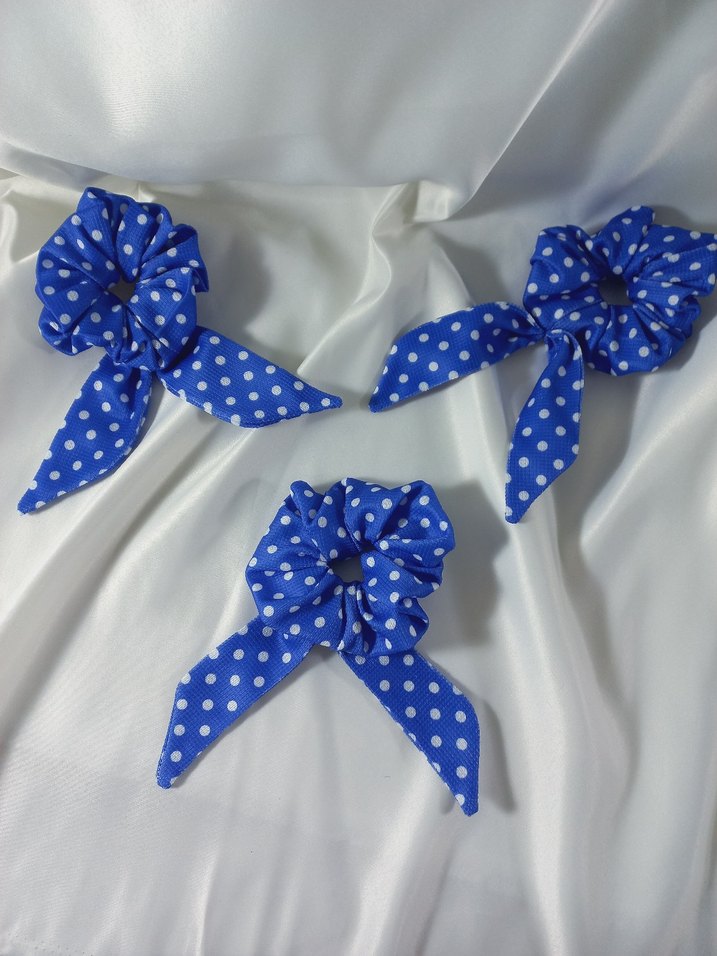 Mavi ve beyaz puantiyeli, fiyonk detaylı saç tokaları. Yumuşak sentetik kumaştan, renkli ve retro pop kültür tarzında.