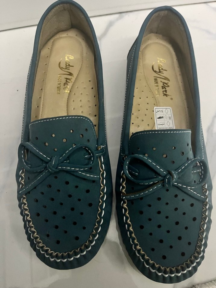 Mavi puantiyeli, parlak desenli, tokalı ve kauçuk malzemeden yapılmış kadın babetleri, günlük rahat kullanım için uygundur.
