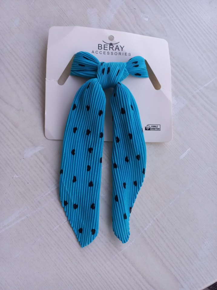 Siyah puantiyeli mavi fiyonk şeklinde sentetik kumaştan yapılmış saç aksesuarı. Bohem ve retro tarzlar için uygundur.