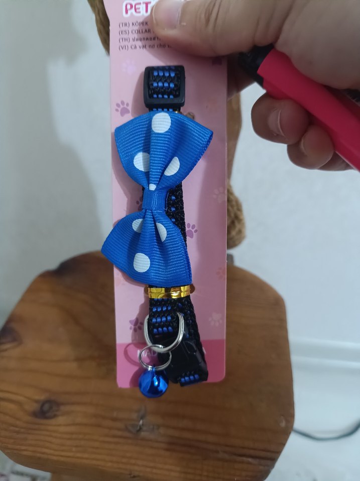 Renkli mavi puantiyeli papyon ve küçük çanlı kedi tasması, konforlu ve şık bir tasarım sunar.