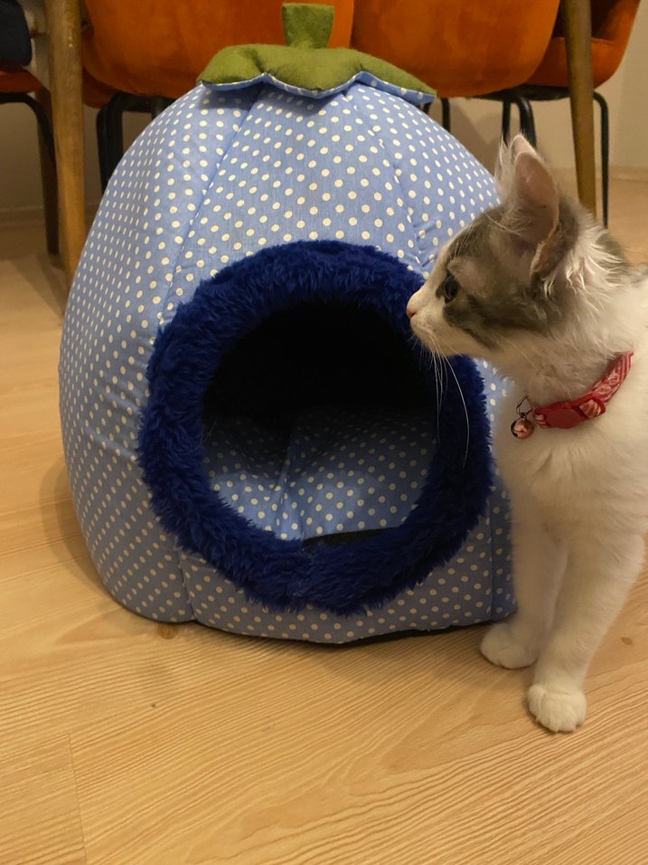 Yeşil yapraklı, mavi puantiyeli ve yumuşak peluş girişli çilek şeklinde kedi yatağı.