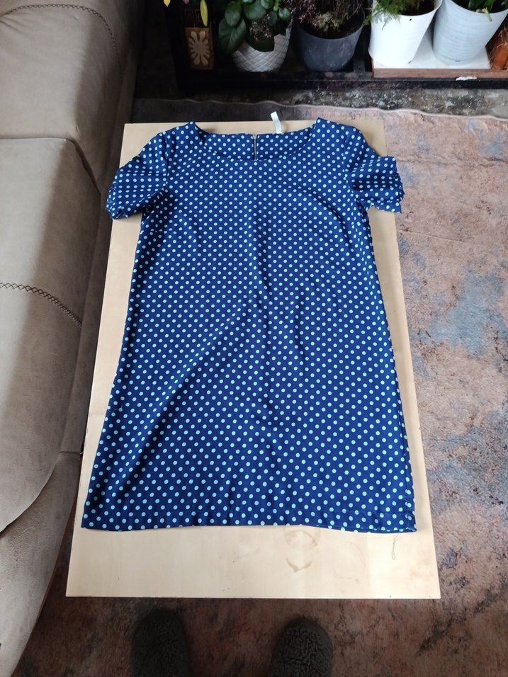 Mavi puantiyeli, kısa kollu, yuvarlak yakalı, bol kesim . Parlak sentetik kumaştan, düğmeli ve günlük kullanıma uygun.
