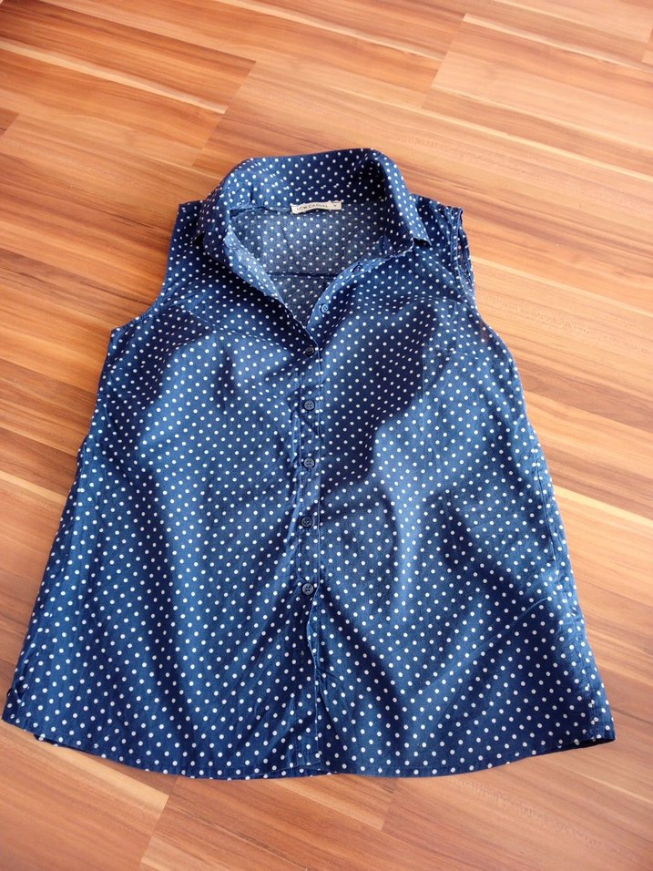 Mavi Puantiyeli Kolsuz Denim Gömlek