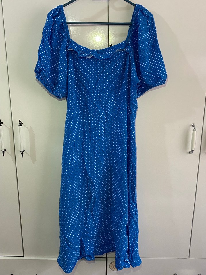 Koyu mavi midi elbise, bol kesim, kısa kabarık kollu ve V yakalıdır. Puantiyeli desen ve fırfır detaylara sahiptir, minimalist ve retro tarzını yansıtır. Hiç bir kusuru yok