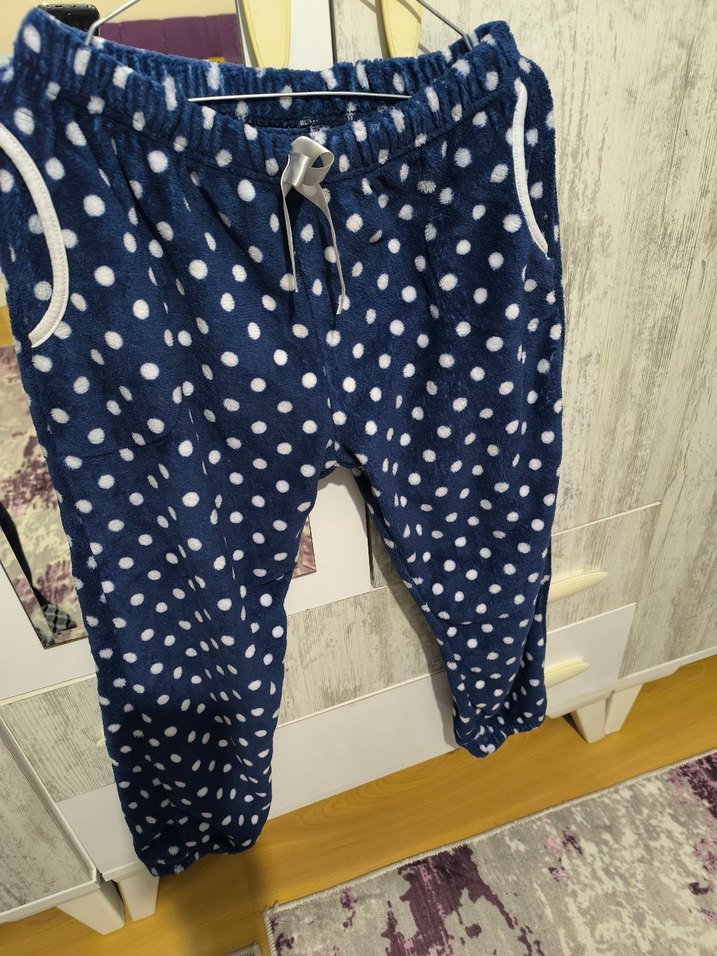 Rahat kesimli, mavi renkli ve puantiyeli desenli, düğmeli kadın pantolonu. Yumuşak ve sıcak kumaştan üretilmiştir, günlük kullanım için uygundur. paça bel lastikli yumuşakcık kaliteli polar aldım giyemedim beden dar geldi çalıştım için iyade gidemedim değerlendirmek istedim cepli