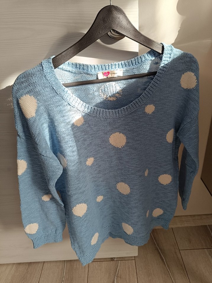 Mavi renkli, puantiyeli triko kazak, uzun kollu ve yuvarlak yaka. uzun kollu değildir dirsek altında modeldir.