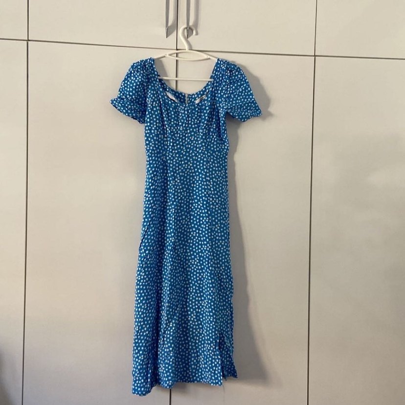 Mavi puantiyeli uzun elbise, kısa kollu ve v yaka kesime sahiptir. Fitted kesim ve fırfır detayıyla günlük sokak stiline uygundur.