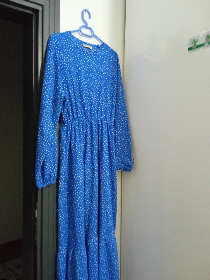 Mavi zemin üzerine beyaz puantiyeli, uzun kollu, bol kesim kadın elbisesi. Sentetik kumaştan, drapeli ve rahat bir yapıya sahip, renkli ve minimalist tarzda.