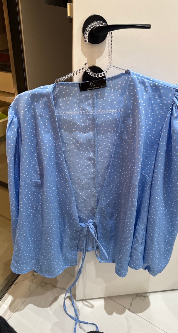 Mavi renkli, V yakalı, düğmeli, uzun kollu, bol kesim kadın bluz. Sentetik kumaştan, pastel puantiyeli desene ve kısa boy uzunluğuna sahiptir.