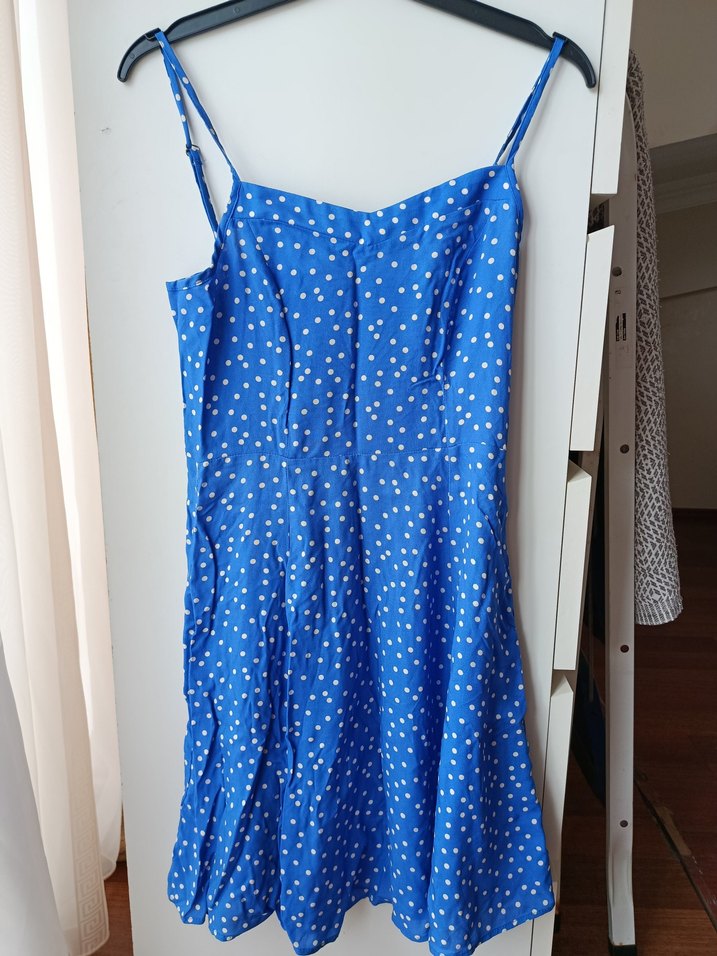 Mavi renkte beyaz puantiyeli, V yakalı ve ayarlanabilir askılı midi elbise. İnce kumaştan, vücuda oturan ve drapeli tasarıma sahip, günlük kullanım için uygun.
