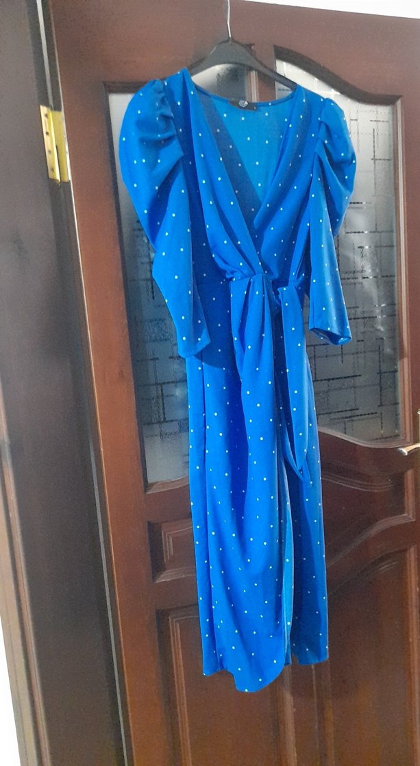 Mavi puantiyeli, parlak sentetik kumaştan yapılmış, V yakalı ve askılı kollu drapeli uzun, vücuda oturan elbise. Bohem ve retro tarzına uygun sokak giyimi için ideal.