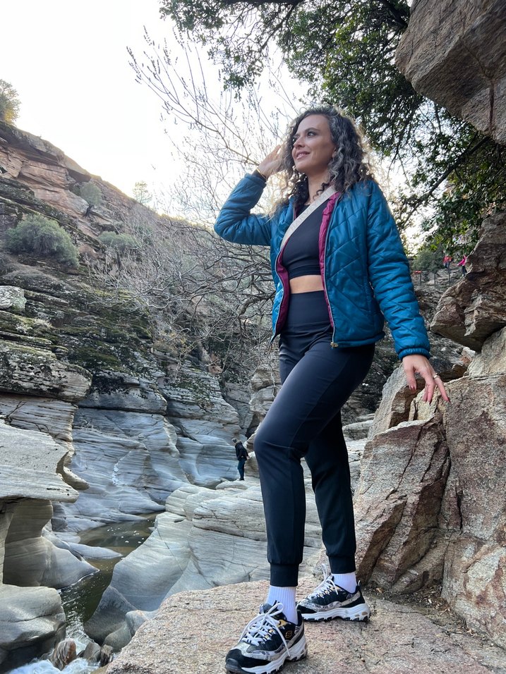 Mavi ve puf detaya sahip uzun kollu, sokak stilinden esinlenen, normal boyda spor mont
