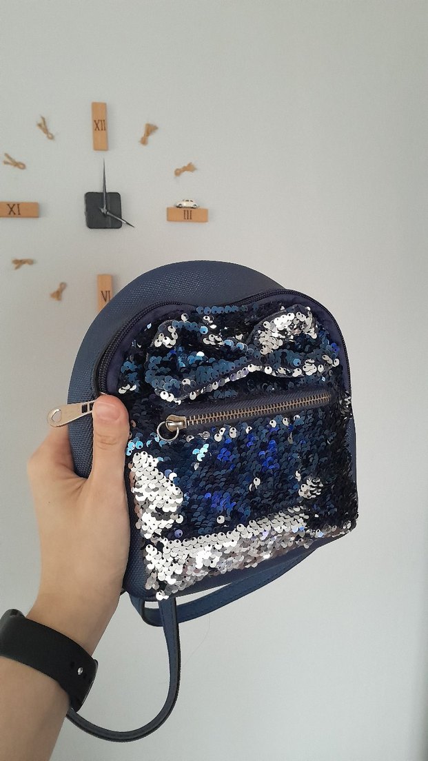 Denim kumaştan, mavi parlak pul payetlerle süslenmiş, yılan desenli kadın sırt çantası. Trendy casual ve parti tarzına uygun.