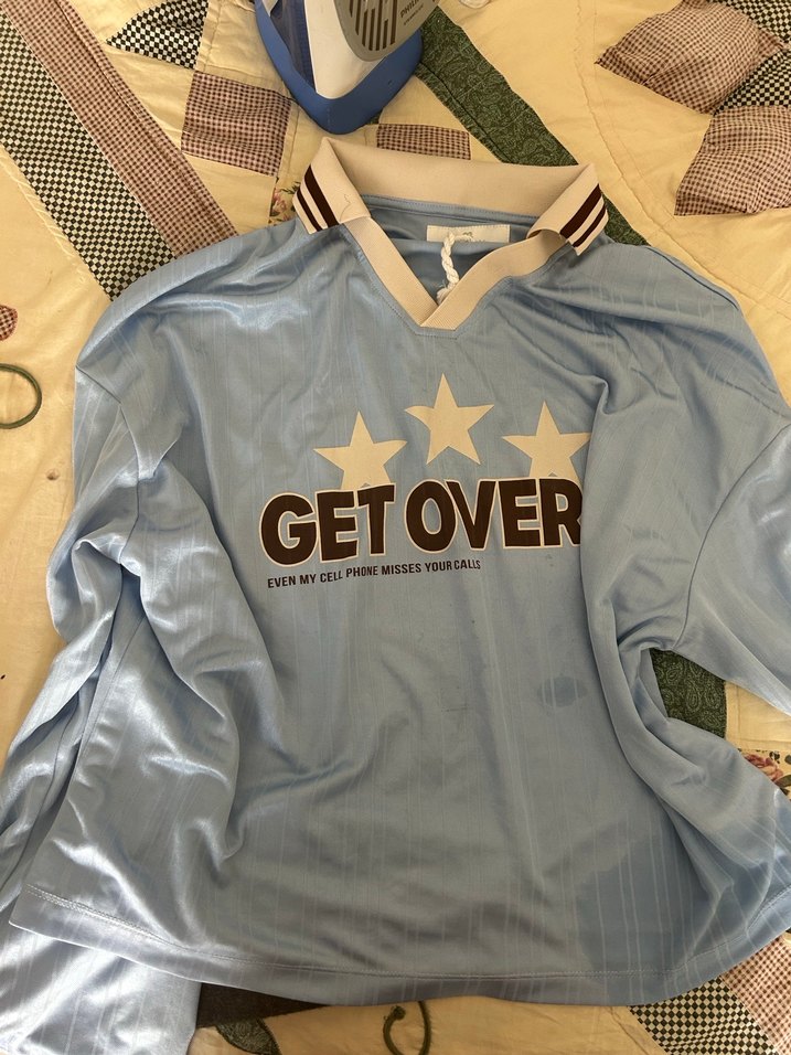 Güncel fıyatı 1590 üstünde su sıçramış lekesı yok 1 defa denendiMavi pamuklu hamile gömleği, uzun kollu ve yakalıdır. Bol kesim, baskılı 'GETOVER' yazısı ve düğmeli detay içerir.
