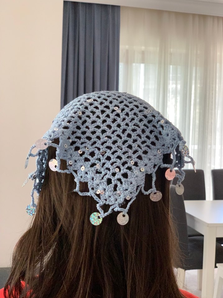 Parlak pullu, mavi renkli, dantel detaylı örme saç aksesuarı, bohem ve retro tarzı yansıtır. Hafif ve yumuşak dokuludur. İstenilen renkte ve ebatta örülür. Elimde hazır suanda bu model mevcuttur. Kendim örüyorum. #bandana #örgübandana