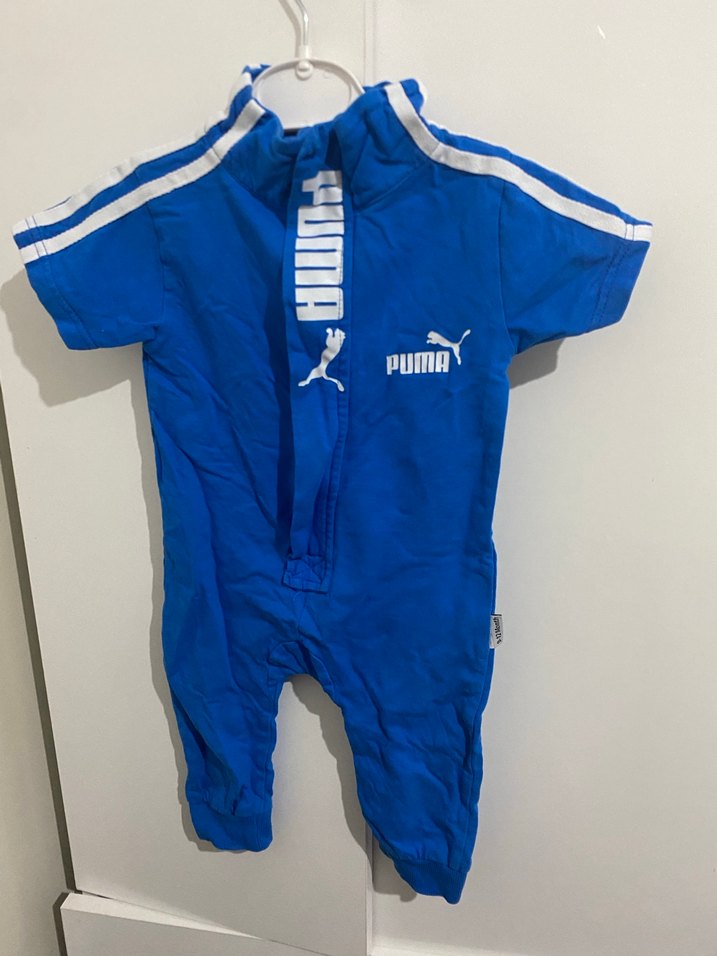 Mavi renkli, kısa kollu ve yüksek yakalı bebek tulumu. Önünde fermuar bulunur ve yumuşak fleece kumaştan yapılmıştır. Beyaz yan çizgiler ve Puma logosu ile spor tarz sunar. 9 ve 12 aylıktır 1 kere giyildi