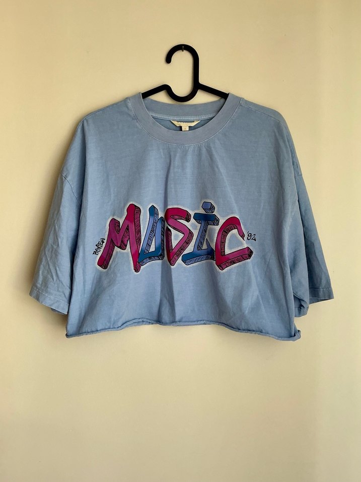 Bu bol kesim, pastel mavi crop tişört kısa kollu ve yuvarlak yakalıdır. 'MUSIC' baskısı ile rock punk havası ve zahmetsiz şıklık sunar.