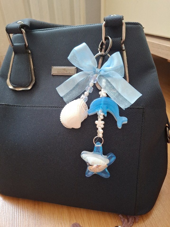 Pastel mavi renkte, püskül, fiyonk ve deniz temalı denizyıldızı, yunus ve deniz kabuğu figürlü bohem ve minimal anahtarlık.