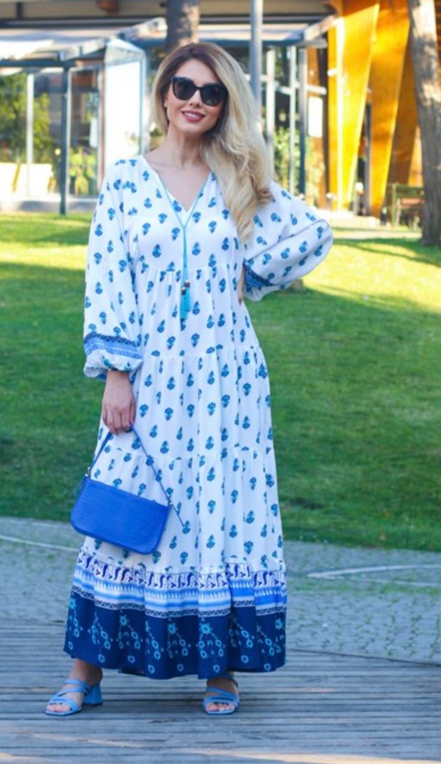 Pamuklu, bol kesim, V yakalı açık mavi uzun elbise. Uzun kollu, tie-dye desenli ve püskül detaylı