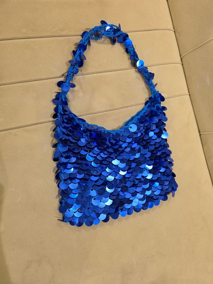 Mavi, koyu renkli kadın çanta, işlemeli detaylar ve püsküllerle süslenmiş. Sentetik kumaştan, bohem parti tarzları için uygun.
