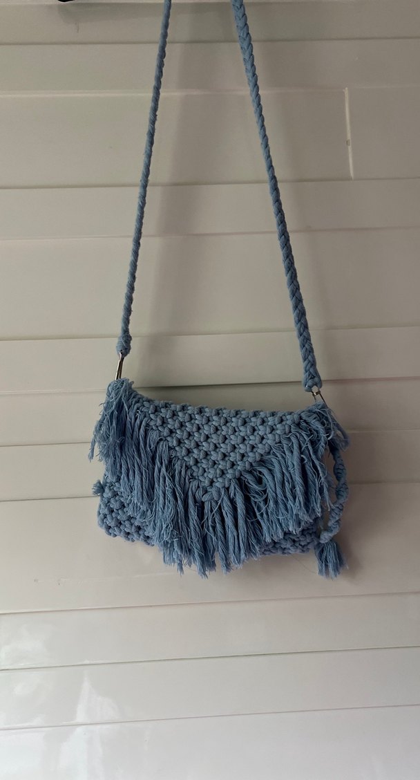 Mavi renkli, püsküllü detaylara sahip örgü bohem tarzında çanta. Örgü askısı ve desensiz yapısıyla günlük kullanıma uygun.