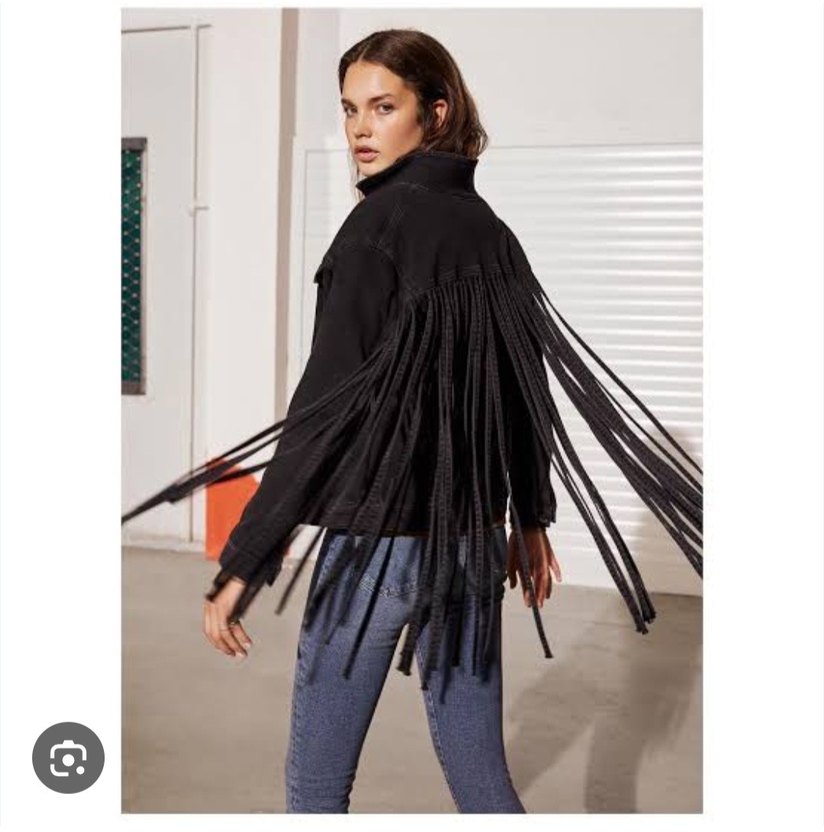 Nakışlı detaylara sahip siyah uzun kot ceket, bol kesim Bohem gotik tarz için püsküllü, parti için uygun. 1 kez kullandım #mavi