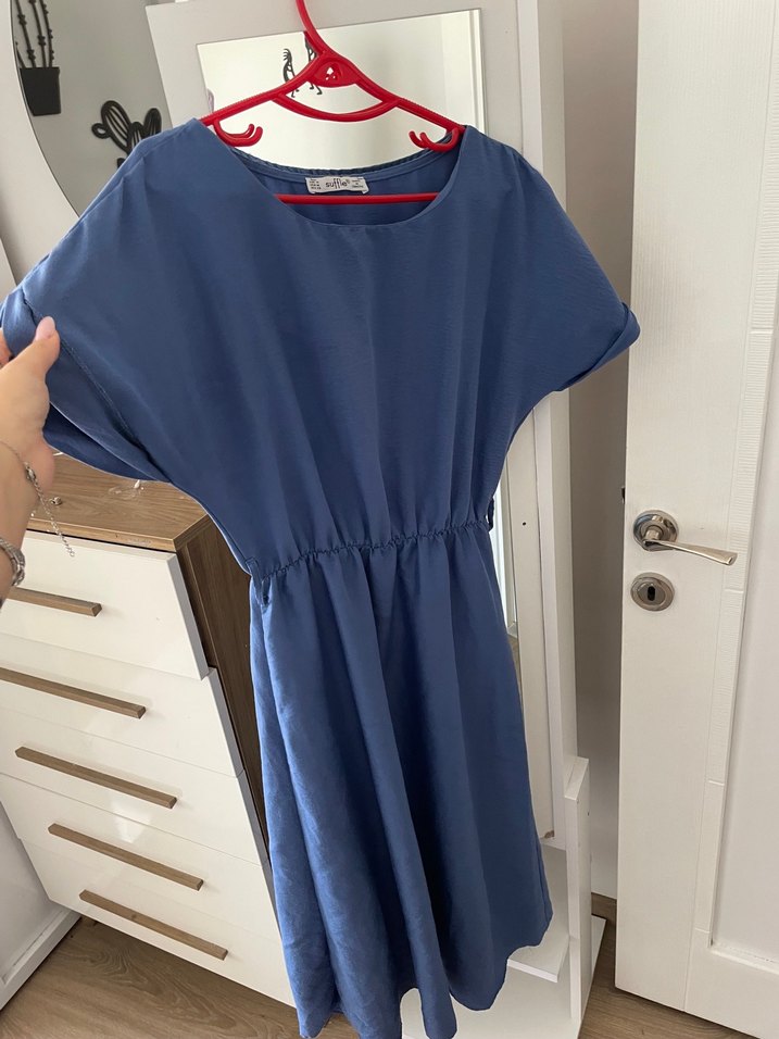 Mavi renkli, bol kesim ve drapeli detaylara sahip hamile elbisesi. Kısa kollu, yuvarlak yaka ve midi boyda, yumuşak sentetik kumaştan üretilmiştir.