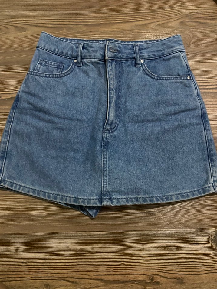 Mavi denim mini etek, rahat kesim ve normal boyda. Desensiz tasarımıyla günlük sokak stiline uygun, zahmetsiz şıklık sunar.