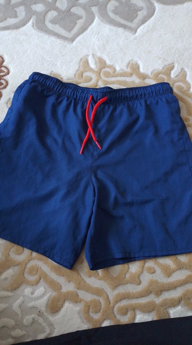 Kırmızı bağcıklı, rahat kesim, normal midi boyunda mavi erkek mayo şortu. Plaj ve sokak stili için uygun, zahmetsiz şıklık sunar.