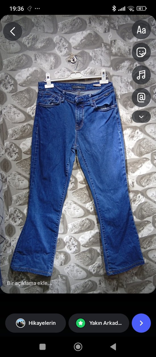 Parlak mavi renkte, tokalı detaylı, rahat kesim kadın denim pantolon. Günlük sokak stiline uygun, rahat ve şık görünümlü.