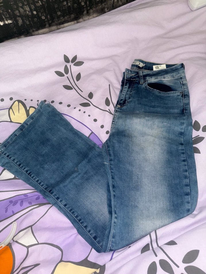Mavi, rahat kesim kadın denim pantolon, tokalı detaylı ve pastel tonlarda. Günlük kullanım için uygun, sokak stili ile uyumlu.