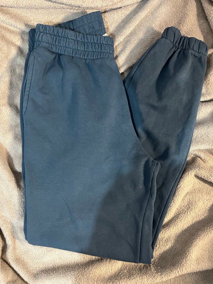 Mavi renk, bol kesim kadın eşofman altı, elastik bel bandı ve yumuşak kumaşla günlük rahat kullanım için uygundur.