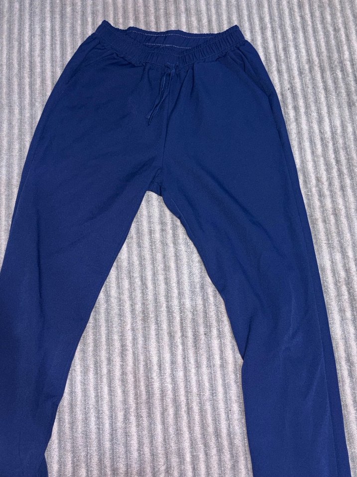 Mavi renkli, bol kesim kadın eşofman altı, elastik bel ve bağcıklı, yumuşak sentetik kumaştan, spor ve günlük kullanım için uygun rahat tasarım.