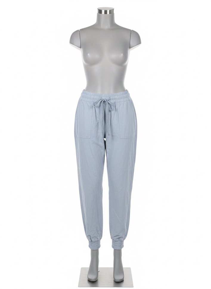 Yumuşak denimden yapılmış, bağcıklı bel ve manşetli bileklerle mavi rahat kesim kadın eşofman altı, gündelik dış mekan kullanımı için uygundur.