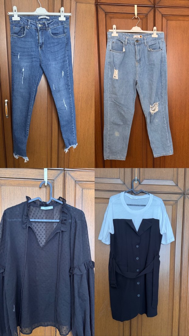 Midi boy, rahat kesim mavi kot pantolon, desen içermeyen sade tasarımla günlük kullanıma uygun rahat stil sunar. Sol üstte dar paça addax marka 38 beden paçaları püsküllü skinny jean Sağ üstteki mom jean 40 beden ama 38 bedene daha uygun Sol altta mango marka s beden transparan siyah bluz oversize bir model olduğu için m bedene de rahatlıkla olur. Sağ alttaki happiness marka 40 beden elbise hiç kullanılmadı 38 bedene de uygun Ürünlerin adet fiyatı 220 tl dir. Toplu alımlarda pazarlık yapılmaktadır.